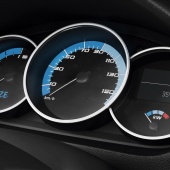 - Un économètre précise au conducteur son niveau de consommation d’énergie. De nouveaux codes couleurs apparaissent : bleu clair pour la zone d’utilisation « normale » du véhicule, bleu foncé pour le fonctionnement optimal et rouge pour la zone de surconsommation susceptible d’affecter plus rapidement l’autonomie du véhicule.