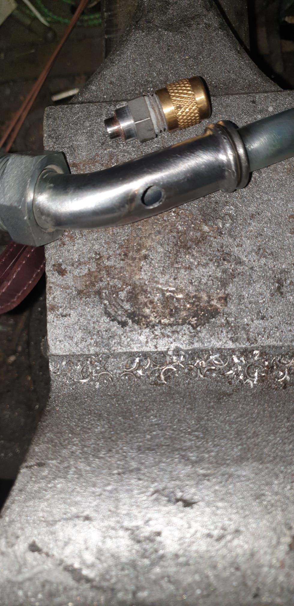 pour le tuyau basse pression , j'étais obligé de recuperer le vieux embout coté evaporateur car les chinois n'en proposait pas , de plus , coté compresseur , l'embout neuf n'éxistait qu'en version sans valve schrader (pour le remplissage) contrairement a l'ancient (non récupérable) ! j'ai donc du souder une valve sur l'embout mais le neuf étant en allu c'était impossible , je l'ai donc soudée coté opposé sur l'ancient embout en acier .