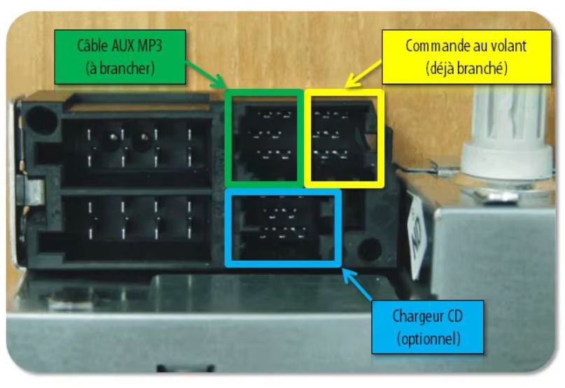 Si l'on désire utiliser un Audio Connexion Box, celui-çi doit être connecté sur le connecteur Bleu 8 voies à la place du changeur 6CD