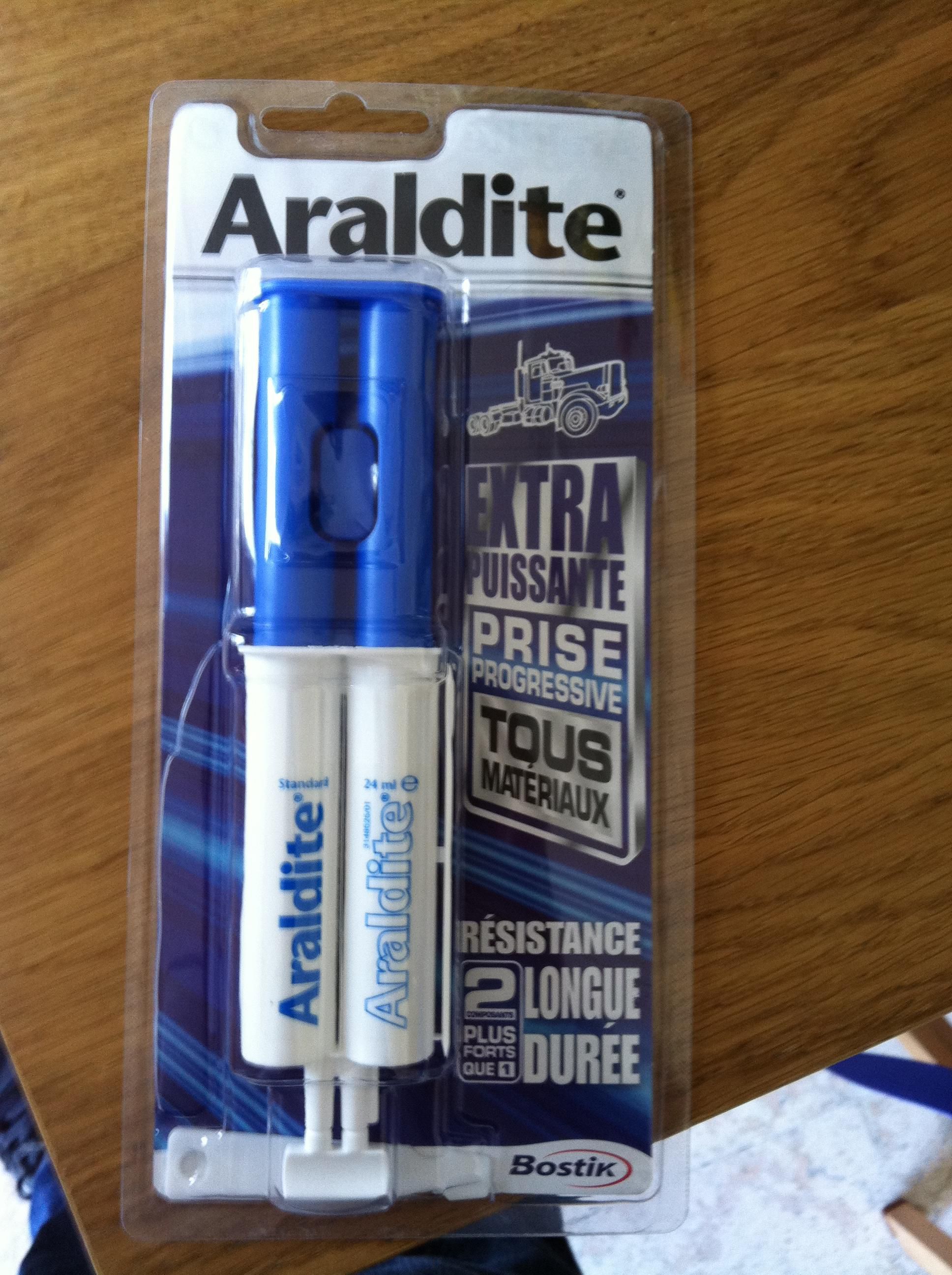 Trouvée chez L-M pour presque 9€. C'est une colle bi-composant a base d'epoxyde (comme la DP490). Elle tiens jusqu'à +70°C donc on verra le temps que ca tiendra. Cet été ça devrait pouvoir le faire vu les chaleurs qu'on a...