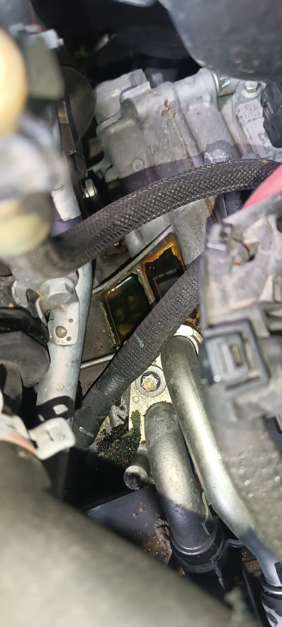 Ca vient probablement du joint sous la plaque vissable des durits en métal en bas de la photo